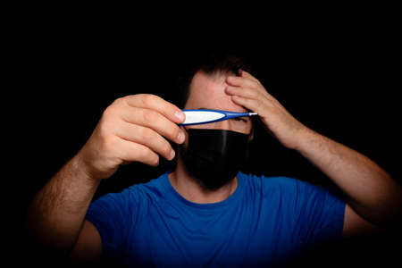 a man in a medical mask looks at a thermometer