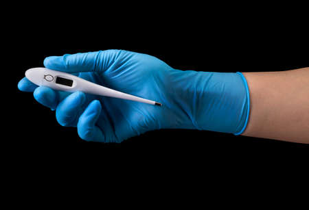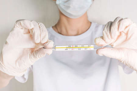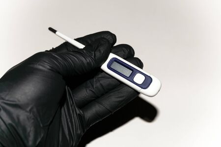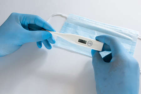 Hands in rubber surgical gloves with a thermometer with normal body temperature 37.0 disease fever