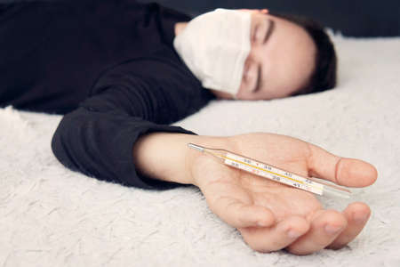 Sick Teenager with Thermometer in the Bed. fever, virus. waiting for a doctor. is treated at home. mom treats son