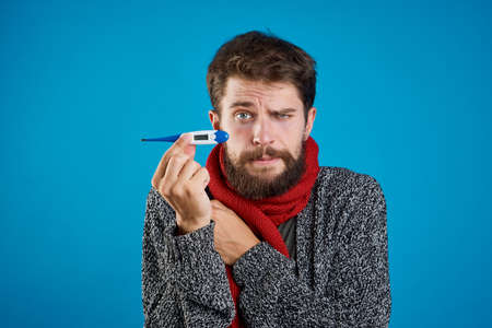 Man is holding a red fever thermometer in his hand