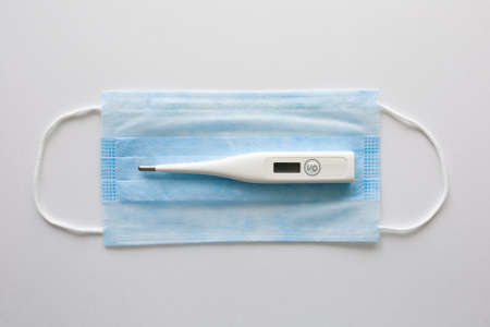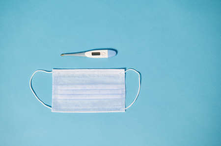 Thermometer and medical mask on the table. Treatment and prevention coronavirus