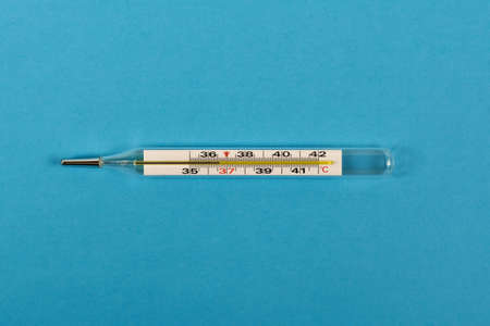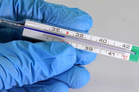 Practitioner doctor hold mercury thermometer in hand with protective gloves, blue background