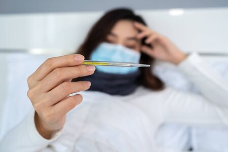 Selective focus on a close up analog thermometer held in hand of a mid adult Indian woman wearing surgical nose mask and lying on sofa, health care concept