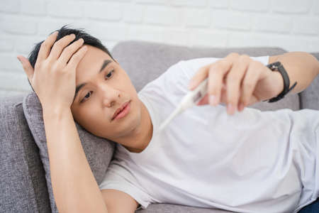 Sick man sitting on bed and checking thermometer after measuring his temperature