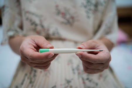 Women hands holding a digital thermometer