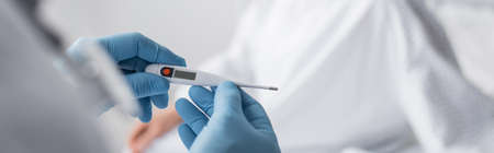 Doctor or nurse in gloves showing thermometer. Thermometer in hands close-up. Healthcare and medical concept.