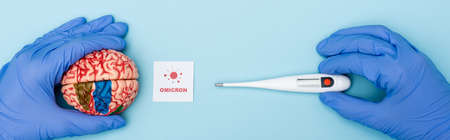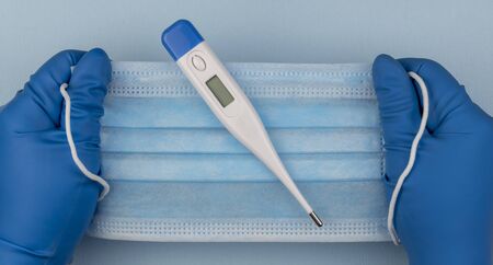 Detail of blue medical gloves with a thermometer on blue background with copy space for text. Coronavirus protection, Covid-19 concept.
