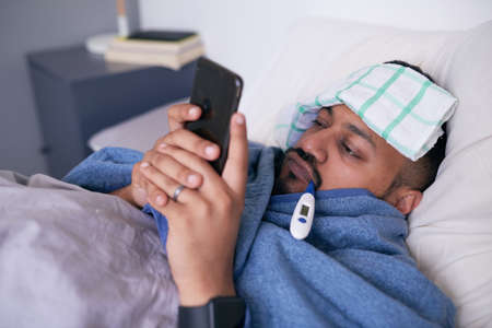 Sick African man takes his temperature while lying in bed with a cooling compress on his head