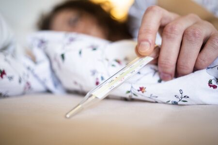 Toddler girl with mercury thermometer lying at home. Kid having high body temperature. Sick, fewer, infection.