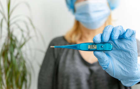 Checking body temperature, 37.6 C. Woman working on laptop from home due to coronavirus self isolation and using a thermometer. Authentic home workplace. Coronavirus outbreak 2020.