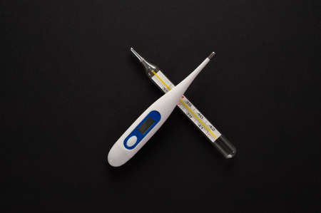 Electronic thermometers. Electronic thermometer on a yellow background. Temperature measurement. Safe thermometer. Modern medical equipment. Science and medicine. Article about safe thermometers. Technologies. Yellow background. Copy space