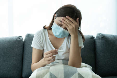 A mid adult Indian woman wearing surgical nose mask, cooling forehead and checking body temperature with a thermometer, health care concept