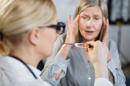 Sick senior woman hand holding thermometer .