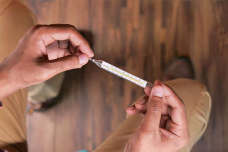 Thermometer in hand close-up with a temperature of 38.6. Side view