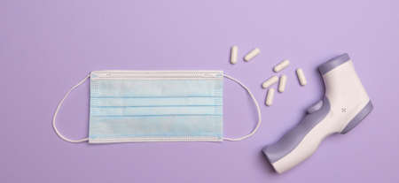 Background from medical pills and surgical masks. Medical background. Electronic medical thermometer.