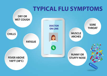 Presentation showing smart phone with doctor online. Typical symptoms of flu are on the white circles around smart phone. All potential trademarks are removed.