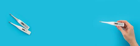 Top view of three thermometers in hand. Electronic device for measuring the temperature of the human body
