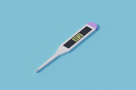 A glass thermometer for measuring the temperature of the human body, blue background.