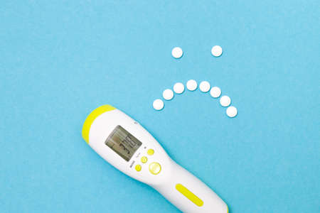 infrared medical thermometer with a temperature of 37.8 degrees Celsius on the display, a sad smiley from round white tablets on a blue background