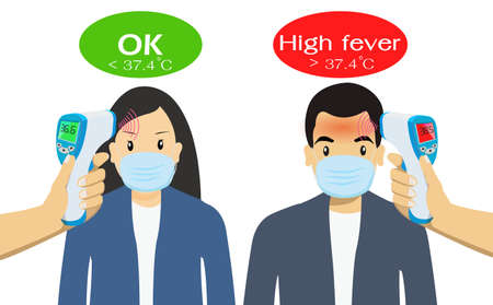 Peoples undergo body temperature tests. by Handheld thermometer. Body temperature compares to Normal and high fever. Key tool The range outbreak control of the Covid-19. Is of the new normal.