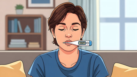A person with closed eyes holds a digital thermometer in their mouth, indicating a fever.