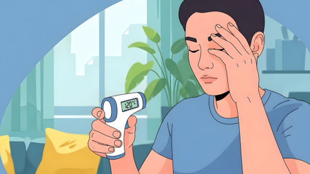 Person holds digital thermometer to forehead, checking for fever in a room. Clear details and vib...
