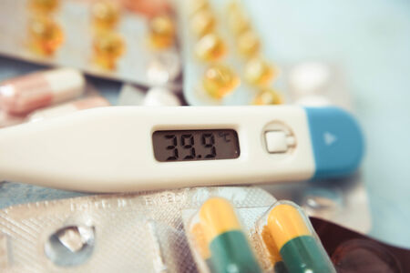 On the blue and red backgrounds lies a thermometer and a question mark lined with pills.