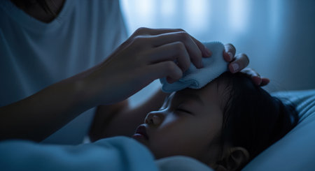 A mother tenderly places a cool, damp cloth on her sleeping child forehead to alleviate a fever in a dimly lit room, depicting a moment of loving care and comfort during illness.