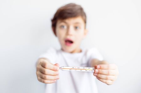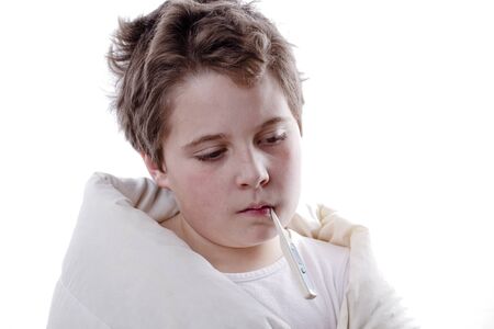 Young boy patient with fever, with digital thermometer and white blanketand flu
