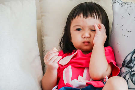 Asian mother measuring temperature girl and hand on forehead on bed at morning time, Sick child have cool gel for reduce high fever, Selective focus, Healthy and infection concept