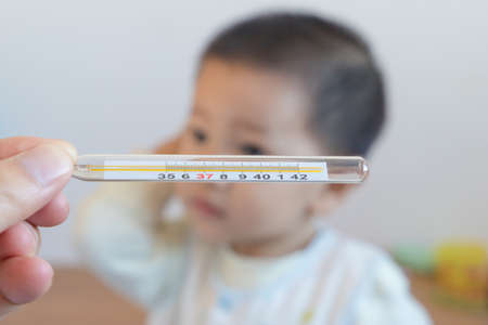 Woman hand holding mercury thermometer with high temperature on background of child sick with flu closeup