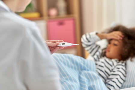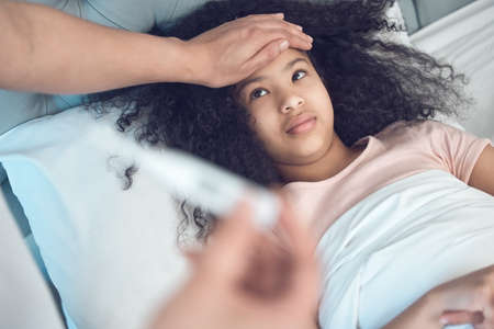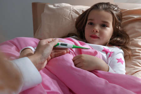 Sick kid. Mother parent checking temperature of her sick daughter with digital thermometer in mouth, child laying in bed taking measuring her temperature for fever and illness, healthcare