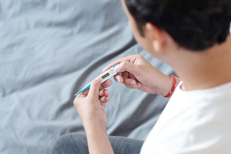Sick man sitting on bed and checking thermometer after measuring his temperature