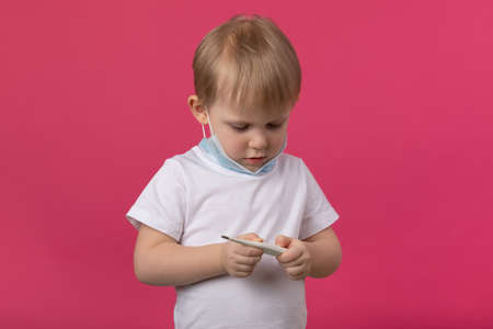 A young child doctor with a medical mask holds a thermometer in his hands and looks at the temperature. Close-up studio shot on a bright pink background for articles childhood diseases and covid-19.