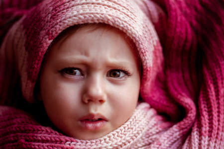 Portrait of scared frightened blurred faced child with thermometer in hands. Worldwide epidemic of coronavirus covid-2019. Health and medical care. Quarantine. Insurance.