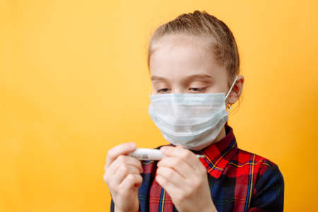 Temperature measurement of a sick child with a non-contact digital infrared thermometer showing fever. Schoolgirl girl with high fever. Pandemic, flu epidemic concept.