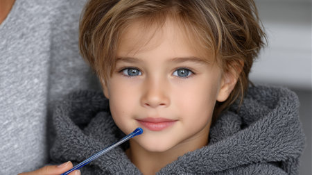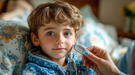 Close-up of a young boy with a thermometer, lying in bed, suggesting themes of caring for a sick child at home. Focus on well-being and parenthood.