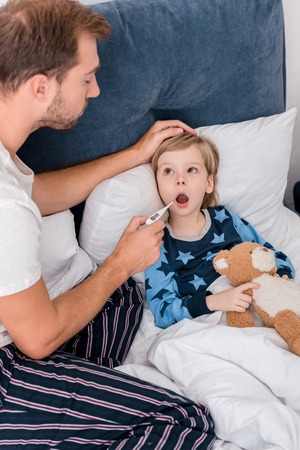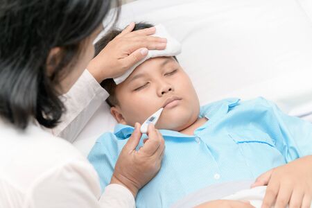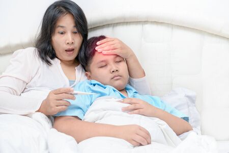 Mother checking temperature of her sick son with high fever, worry and health care concept.