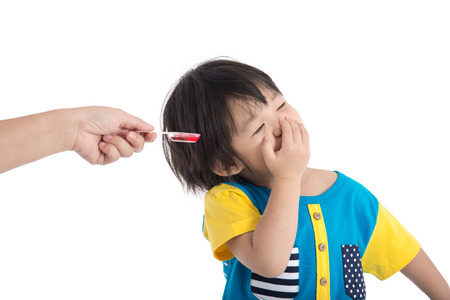 Little asian baby took a hand off the mouth while mother is feeding medicine,on white background isolated