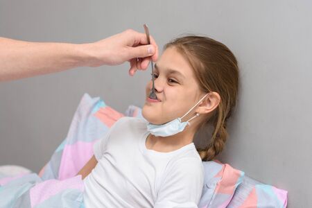 Portrait of a girl with a thermometer to measure the temperature in her mouth. Treating children
