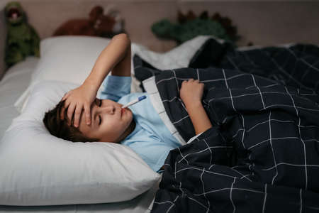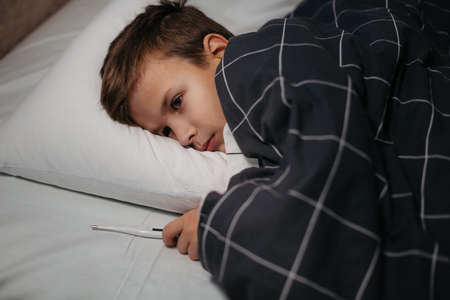 Sad child laying in bed with thermometer in his mouth. Temperature measurement. Sick boy on bed late at night