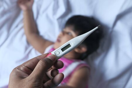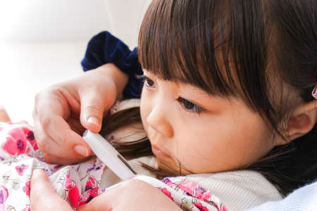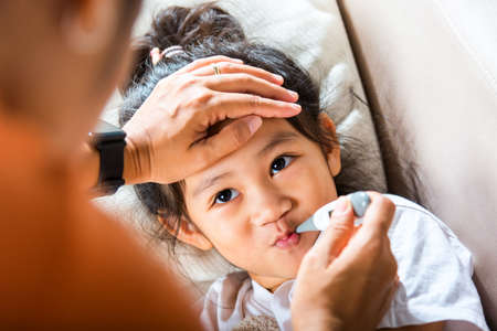 mother hand taking temperature with girl is a sick laying on sofa, Kid patient with mom check thermometer, child illness, medical concept.