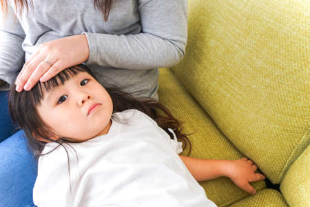 Sick Asian girl daughter sleeping on the couch with fever while mother checking temperature on her forehead