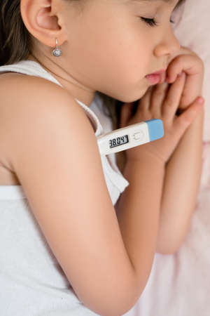 A child with a thermometer lies sick in his bed. The baby has a high body temperature. The girl is sick . Close-up thermometer shows high temperature
