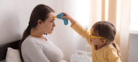 little girl wearing uniform playing doctor, nurse with young mum, nanny in bedroom, checking mother throat, measures temperature, take care, family spend leisure time at home together role play game
