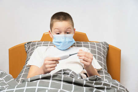 sick child looks at the thermometer. a boy in a medical mask lies in bed and is surprised by the high temperature