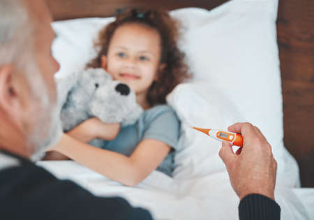 Do you have a fever. Shot of a doctor checking a sick little girls temperature at home.