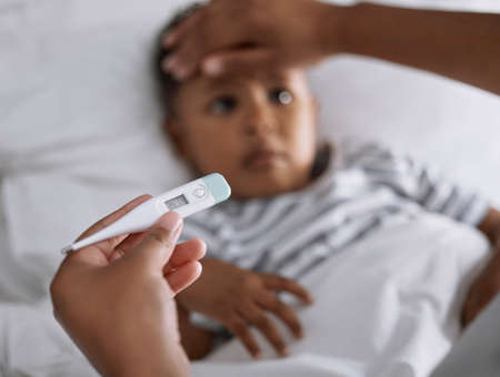 Mother measuring temperature of ill kid. Sick child with high fever laying in bed and mother holding thermometer, Healthy care concept.