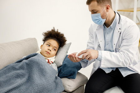 Virus outbreak concept. Little African American girl suffering from fever and her grandpa with thermometer at home