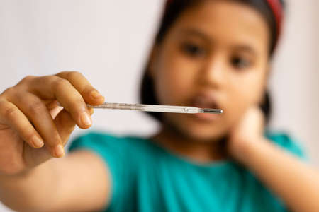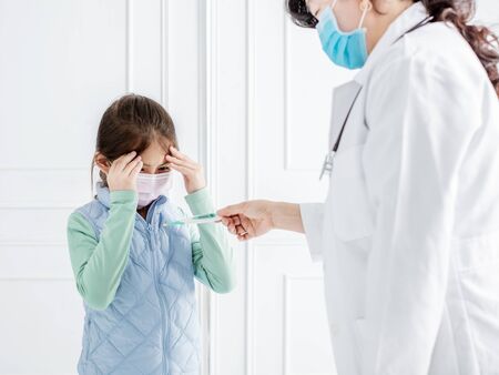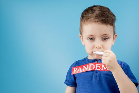 measuring Fever temperature. Child with thermometer. World pandemic concept.